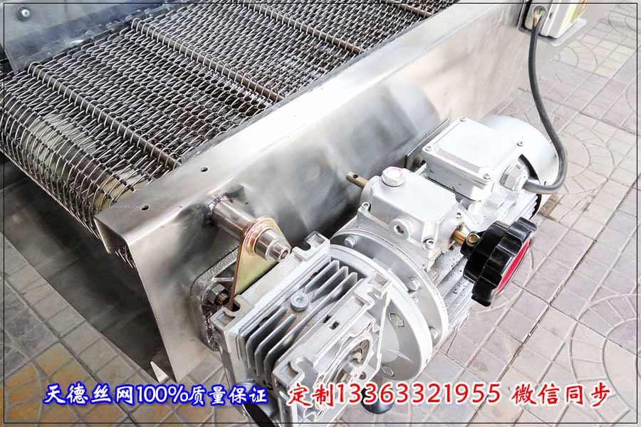 網帶輸送機總長5米,輸送機總高度為70公分,輸送機的總寬度為600毫米。整機采用不銹鋼304材質,輸送部分采用鋼絲編織型金屬輸送帶,輸送帶總長為10米,總寬度為500毫米,鋼絲編織的孔徑為5*15毫米,穿桿直徑為8毫米,鏈節(jié)距為38.1毫米,桿與桿之間的距離為150毫米左右。特別要求電機外要采用防雨罩罩起來,網帶輸送機上面要安裝排風扇,排風扇離著金屬輸送帶要有30公分的距離,整機采用活動腳安裝,方便挪動。整條輸送機下面安裝一個托盤,托盤可移動,用來接住瀝出來的油。
