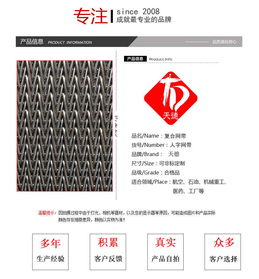 人字形網(wǎng)帶應(yīng)用:主要應(yīng)用于食品烘干機(jī)、蔬菜、海產(chǎn)品清洗機(jī),巴氏機(jī),方便面米粉蒸煮、熱收縮膜包裝機(jī)。玻璃瓶罐、食品、燈炮、金屬、器皿、化纖、印染、醫(yī)藥、電子、粉末冶金、熱處理、木材、物流輸送等各行業(yè)自動(dòng)裝置和自動(dòng)流水線的使用;焦?fàn)t煤氣及電子紅外線等各種窯爐系統(tǒng)的傳動(dòng)使用等食品機(jī)械,玻璃機(jī)械,輸送機(jī)械。