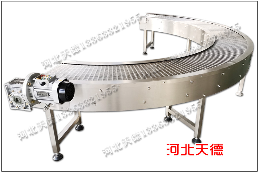 轉(zhuǎn)彎角度為180度,客戶要兩端與直線網(wǎng)帶輸送機(jī)進(jìn)行銜接組成流水線,用來(lái)輸送小箱子,整條輸送線平穩(wěn),這臺(tái)轉(zhuǎn)彎?rùn)C(jī)整機(jī)采用不銹鋼304材質(zhì)的材料加工的。