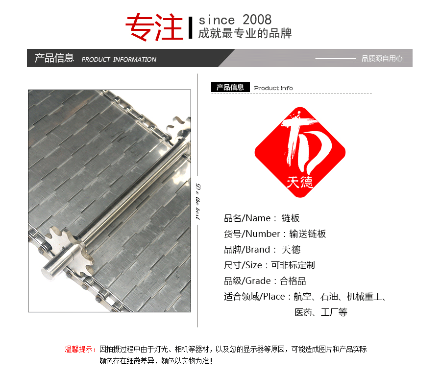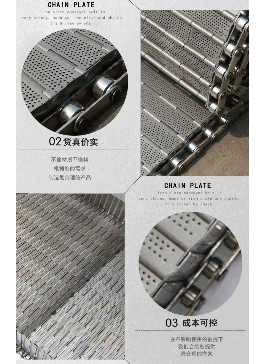 鏈板輸送帶:是采用不銹鋼板沖壓成型,鏈條傳動(dòng),每節(jié)由6-10mm支撐桿連接,其運(yùn)動(dòng)平穩(wěn)、力量大,適合用于輸送細(xì)小的高密度物件,輸送過程中運(yùn)轉(zhuǎn)平穩(wěn),安裝更換方便,成本高,使用壽命較長。