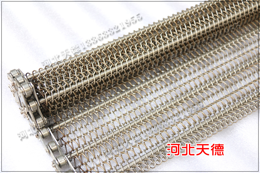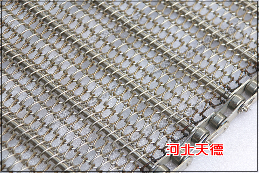 鏈條節(jié)距為38.1毫米,鏈桿直徑為8毫米,每米載重大概在10公分,烘干的食品大小大約為10*20毫米,河北天德廠家為其設計的鋼絲直徑為1.5毫米,孔大小為5*10毫米。