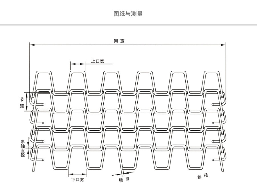 長城網(wǎng)帶材質(zhì):有A3低碳鋼、45#鋼、1Cr13耐熱鋼、 不銹鋼、304不銹鋼、1Cr18Ni9Ti不銹鋼、0Cr18Ni14NO2CU2耐熱耐酸鋼等