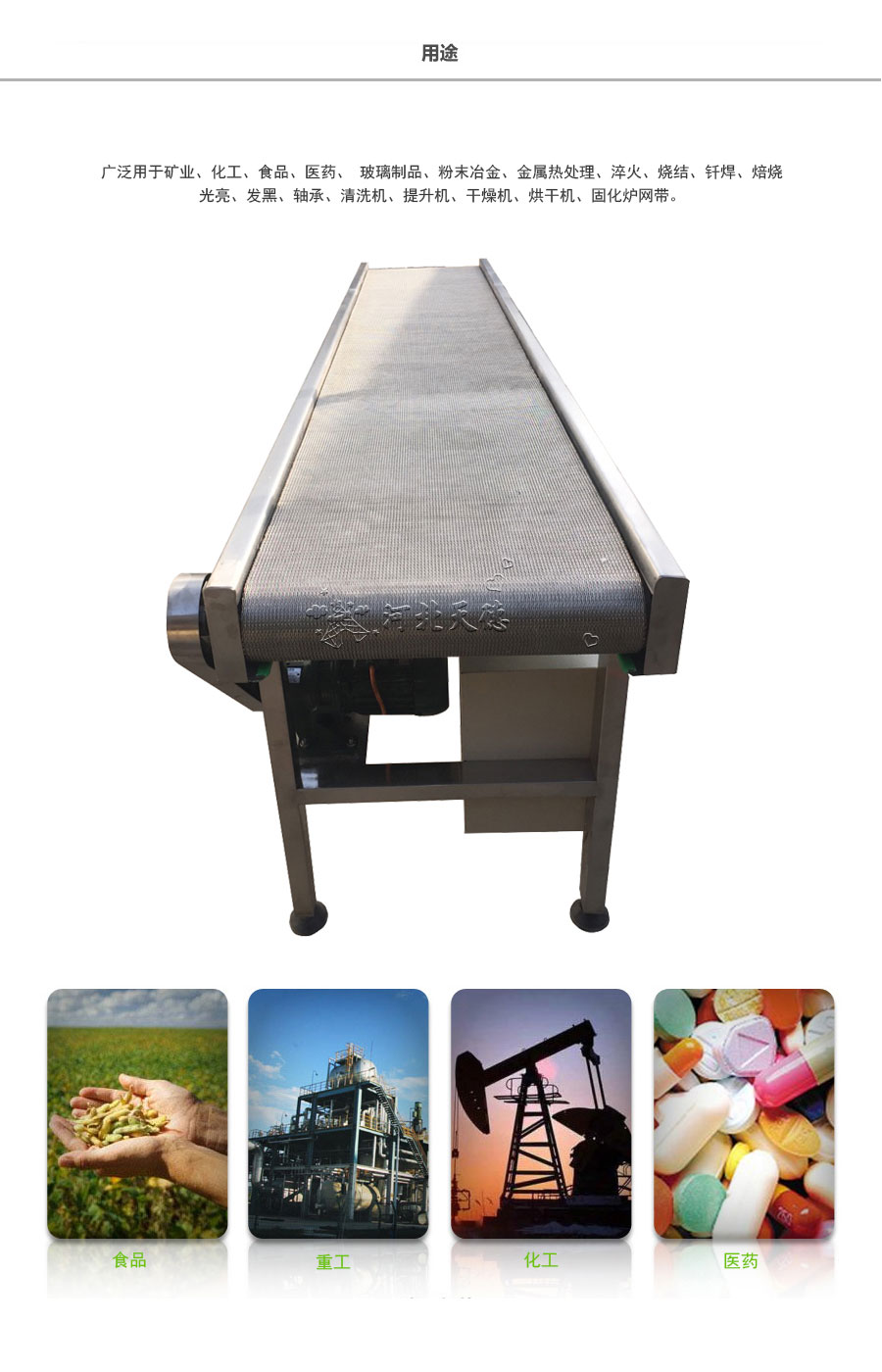 人字形網(wǎng)帶應(yīng)用:主要應(yīng)用于食品烘干機(jī)、蔬菜、海產(chǎn)品清洗機(jī),巴氏機(jī),方便面米粉蒸煮、熱收縮膜包裝機(jī)。玻璃瓶罐、食品、燈炮、金屬、器皿、化纖、印染、醫(yī)藥、電子、粉末冶金、熱處理、木材、物流輸送等各行業(yè)自動(dòng)裝置和自動(dòng)流水線的使用;焦?fàn)t煤氣及電子紅外線等各種窯爐系統(tǒng)的傳動(dòng)使用等食品機(jī)械,玻璃機(jī)械,輸送機(jī)械。