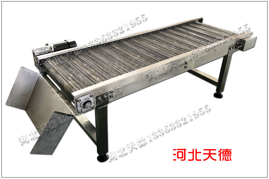整臺輸送機(jī)采用不銹鋼304材質(zhì)加工,輸送機(jī)機(jī)架厚度為3毫米,金屬輸送帶鋼絲編織鏈條輸送帶來傳送物料。